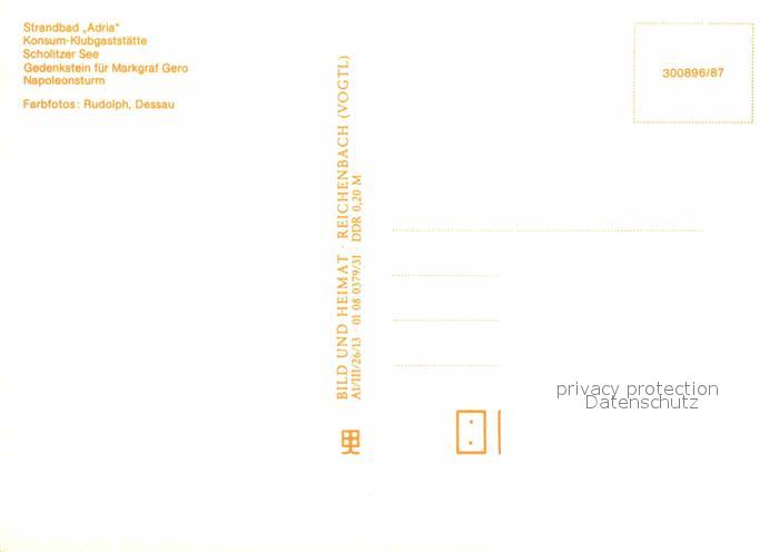 72678575 Mildensee Strandbad Adria Konsum Klubgaststaette Scholitzer See Gedenkstein Markgraf Gero Napoleonsturm postalisch nicht gelaufen Erhaltung siehe scans [FriedD77] KatCode: 11110015001000