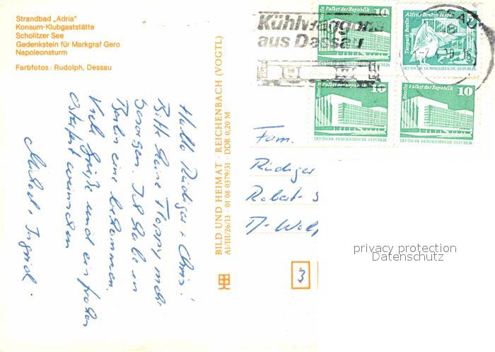 72820964 alte Postkarte Mildensee Strandbad Adria Konsum Klubgaststaette Scholitzer See Markgraf Gero Gedenkstein Napoleonsturm postalisch gelaufen Erhaltung siehe scans [FriedD77] KatCode: 11110015001000
