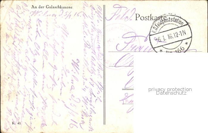 32325493 alte Postkarte Militaria Feldkueche Field Kitchen Cuisne Mobile Cucina da Campo Weltkrieg 1 an der gulaschkanone postalisch gelaufen Feldpost Erhaltung siehe scans KatCode: 22300100100100