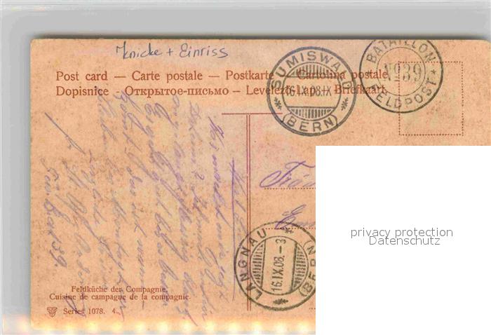33938467 Militaria Feldkueche Field Kitchen Cuisne Mobile Cucina da Campo WK1 Knicke Einriss Schweiz postalisch gelaufen Feldpost – Stempel Erhaltung siehe scans [Tetiaova] Feldpost – Stempel alte Postkarte Teti Katcode 22300100100100