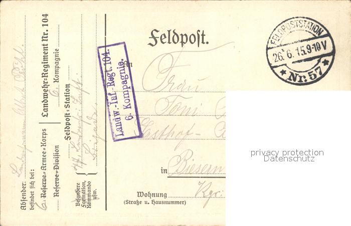 32512005 Militaria Landwehr Regimentskarte Gruss aus Frankreich Landwehr Regiment 104 WK1 Feldpost Erhaltung siehe scans KatCode: 22300270270270