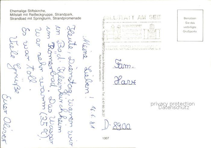 72438111 alte Postkarte Millstatt Millstaettersee Ehemalige Stiftskirche Reisseckgruppe Strandbad mit Springturm postalisch gelaufen Erhaltung siehe scans KatCode: 11390212020620