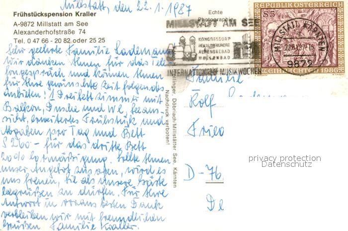 73320400 alte Postkarte Millstatt Millstaettersee Pension Kraller postalisch gelaufen Erhaltung siehe scans [FriedD77] KatCode: 11390212020620