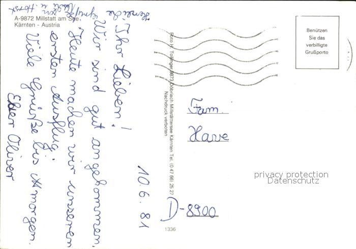 72438119 alte Postkarte Millstatt Millstaettersee Sprungturm Abendstimmung Surfer Fliegeraufnahme postalisch gelaufen Erhaltung siehe scans KatCode: 11390212020620