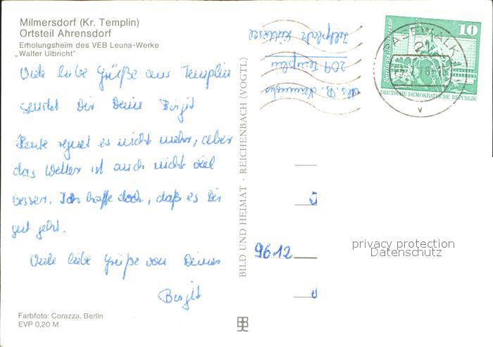 72370909 alte Postkarte Milmersdorf Uckermark Erholungsheim des VEB Leuna-Werke Walter Ulbricht postalisch gelaufen Erhaltung siehe scans KatCode: 11110012073396