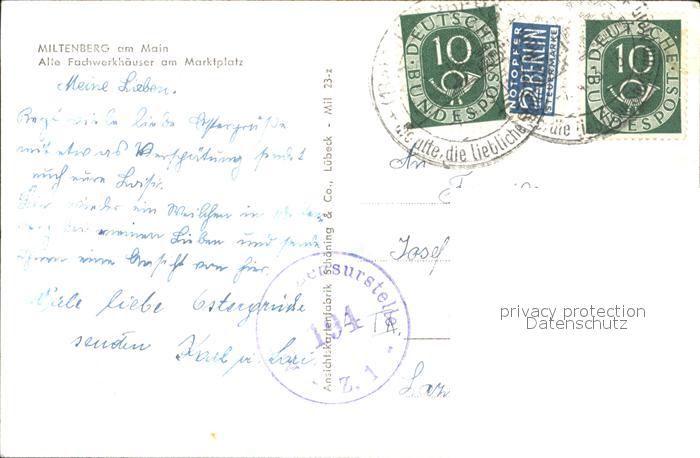 71861467 alte Postkarte Miltenberg Main Alte Fachwerkhaeuser am Marktplatz Brunnen Zensur Stempel postalisch gelaufen Erhaltung siehe scans KatCode: 11110009676139