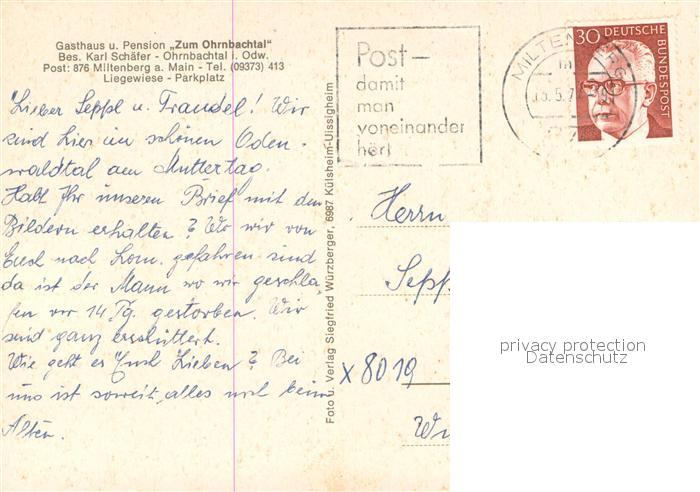 73725011 alte Postkarte Miltenberg Main Gasthaus Pension zum Ohrnbachtal Restaurant Landschaftspanorama postalisch gelaufen Erhaltung siehe scans [FriedD77] KatCode: 11110009676139