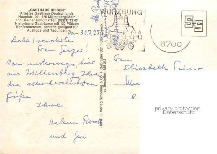 73777403 alte Postkarte Miltenberg Main Gasthaus Riesen aeltestes Gasthaus Deutschlands Gastraum postalisch gelaufen Erhaltung siehe scans [FriedD77] KatCode: 11110009676139