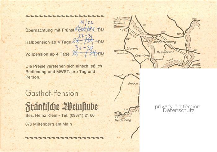 73339599 Miltenberg Main Gasthof Pension Fraenkische Weinstube Fachwerkhaus postalisch nicht gelaufen Werbekarte (keine Postkarte) Erhaltung siehe scans [FriedD77] KatCode: 11110009676139