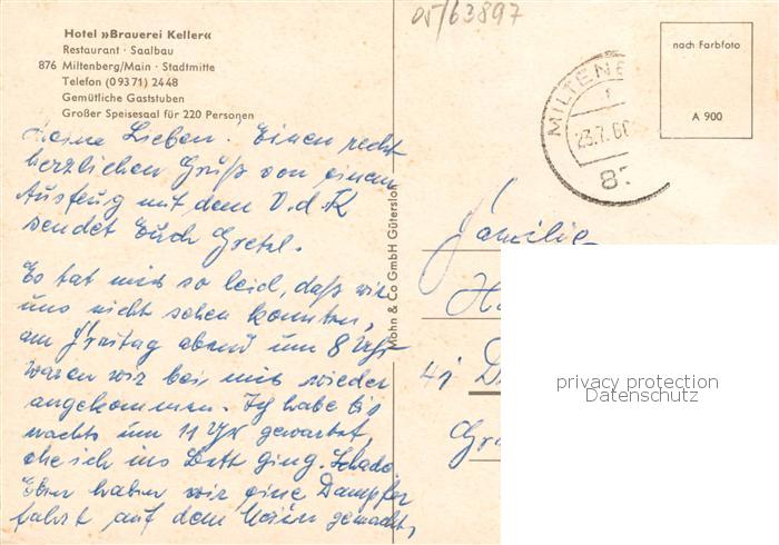 73863075 alte Postkarte Miltenberg Main Hotel Brauerei Keller Restaurant Saalbau postalisch gelaufen Erhaltung siehe scans [WerneD78] KatCode: 11110009676139