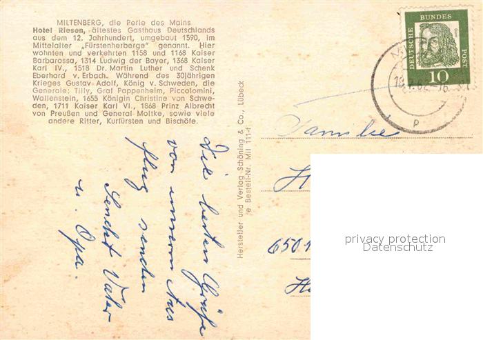 72668418 alte Postkarte Miltenberg Main Hotel Riesen postalisch gelaufen Erhaltung siehe scans [AndreD76] KatCode: 11110009676139