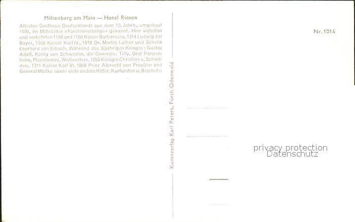 72464060 Miltenberg Main Hotel Riesen postalisch nicht gelaufen Erhaltung siehe scans KatCode: 11110009676139
