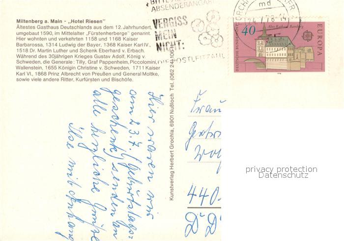 73649314 alte Postkarte Miltenberg Main Hotel Riesen postalisch gelaufen Erhaltung siehe scans [WerneD78] KatCode: 11110009676139