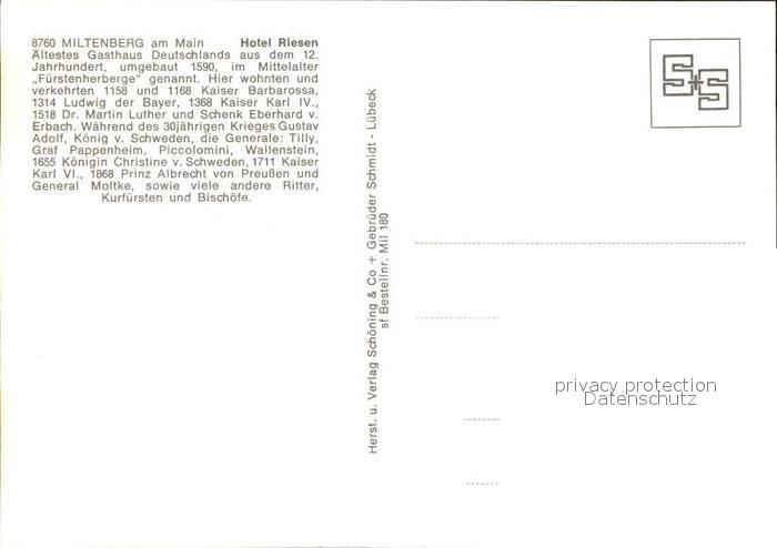 72247215 Miltenberg Main Hotel Riesen postalisch nicht gelaufen Erhaltung siehe scans KatCode: 11110009676139