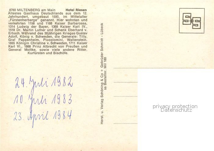 73175783 Miltenberg Main Hotel Riesen postalisch nicht gelaufen Erhaltung siehe scans [NatalD47] KatCode: 11110009676139
