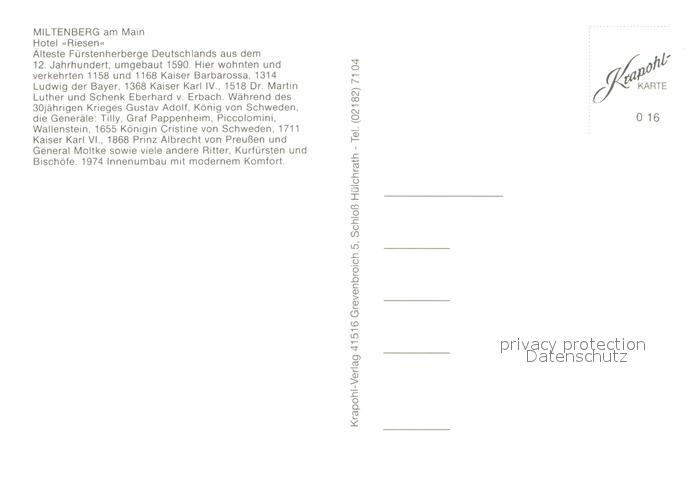 73719819 Miltenberg Main Hotel Riesen aeltestes Gasthaus Deutschlands postalisch nicht gelaufen Erhaltung siehe scans [WerneD78] KatCode: 11110009676139