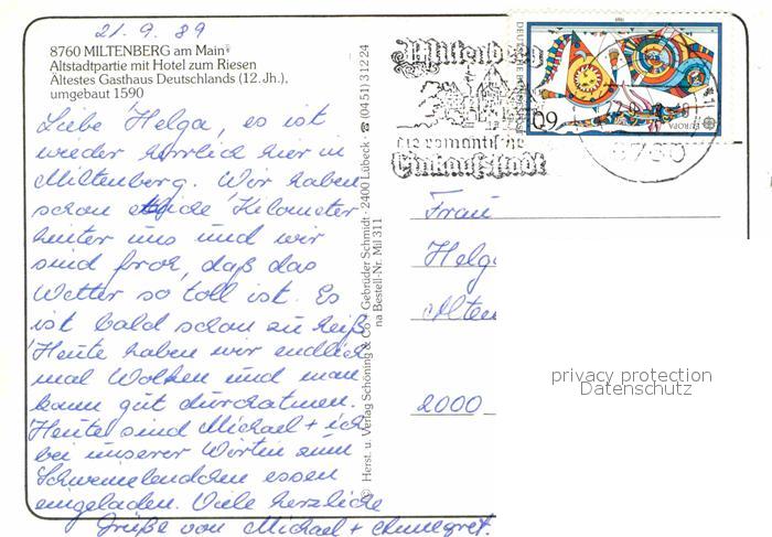 72866710 alte Postkarte Miltenberg Main Hotel zum Riesen postalisch gelaufen Erhaltung siehe scans [NatalD47] KatCode: 11110009676139