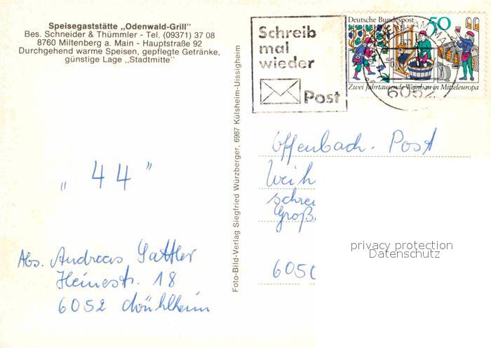 72828293 alte Postkarte Miltenberg Main Stadtpanorama Gaststaette Odenwald Grill Fachwerkhaus postalisch gelaufen Erhaltung siehe scans [FriedD77] KatCode: 11110009676139