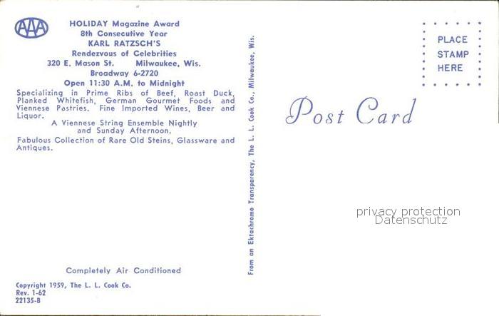 72006866 Milwaukee Wisconsin Karl Ratzsch’s Restaurant postalisch nicht gelaufen Erhaltung siehe scans KatCode: 14140520000000
