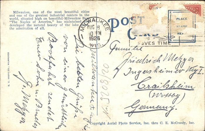 11112397 old postcard Milwaukee Wisconsin Luftbild postalisch gelaufen KatCode: 14140520000000