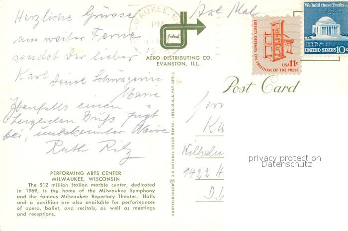 73049705 old postcard Milwaukee Wisconsin Performing Arts Center at Dusk postalisch gelaufen Erhaltung siehe scans [WerneD78] KatCode: 14140520000000