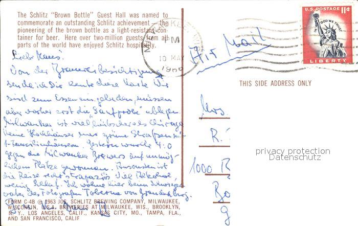 72161921 old postcard Milwaukee Wisconsin Schlitz Brown Bottle Guest Hall postalisch gelaufen Erhaltung siehe scans KatCode: 14140520000000