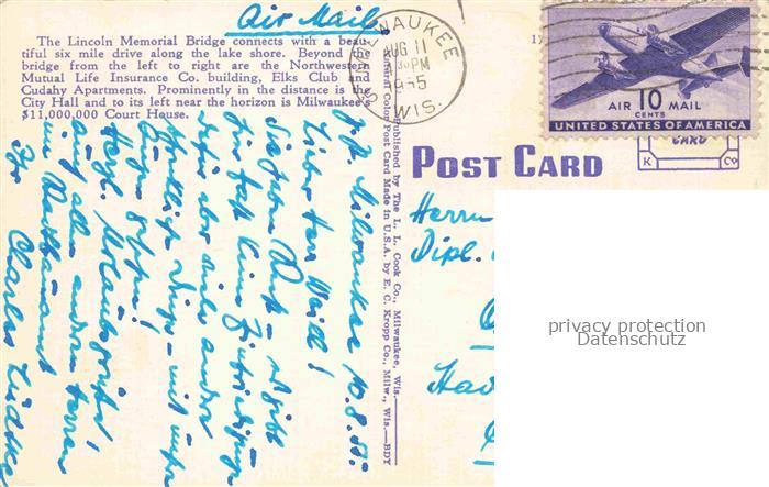 74023126 old postcard Milwaukee Wisconsin USA Lincoln Memorial Bridge from Lake Michigan postalisch gelaufen Erhaltung siehe scans [WerneD78] KatCode: 14140520000000