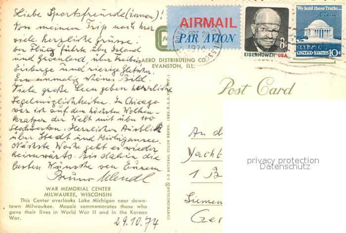 72930714 old postcard Milwaukee Wisconsin War Memorial Center postalisch gelaufen Erhaltung siehe scans [NatalD47] KatCode: 14140520000000