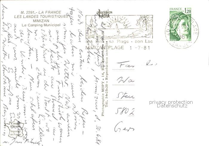 12614430 carte postale Mimizan Landes Camping Municipal postalisch gelaufen Erhaltung siehe scans [LiesaD40] KatCode: 11170040240184