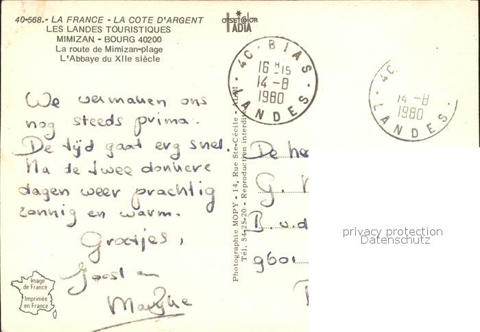 12246295 carte postale Mimizan Landes Route de Mimizan- plage postalisch gelaufen Erhaltung siehe scans KatCode: 11170040240184