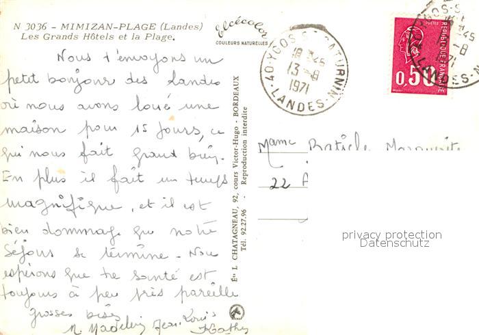 13589746 Mimizan Plage Les Grands Hotels et la Plage postalisch gelaufen Erhaltung siehe scans [WerneD78] carte postale Wern Katcode 11170040240184