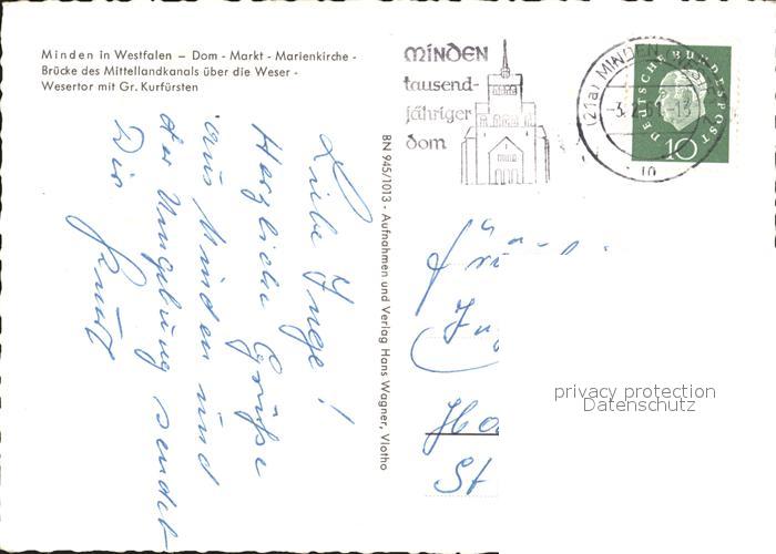 72116607 alte Postkarte Minden Westfalen Dom Markt Marienkirche Bruecke des Mittellandkanals ueber Weser postalisch gelaufen Erhaltung siehe scans KatCode: 11110005770024