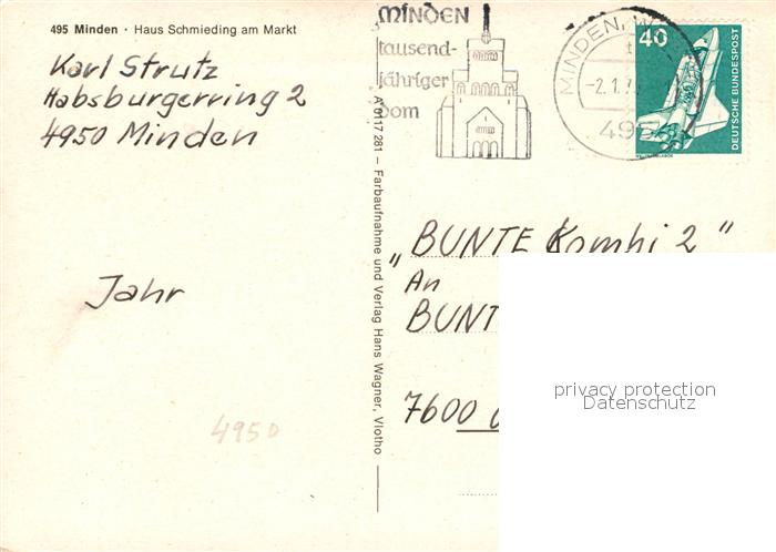 73618033 alte Postkarte Minden Westfalen Haus Schmieding am Markt postalisch gelaufen Erhaltung siehe scans [KathaD81] KatCode: 11110005770024