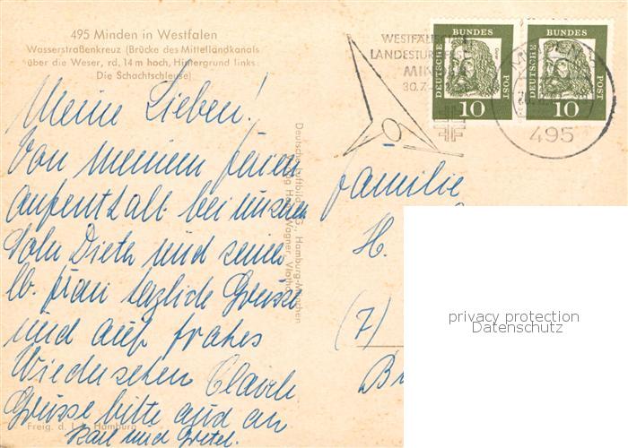 73829733 alte Postkarte Minden Westfalen Weser ueberfuehrung des Mittellandkanals ueber die Weser mit Schachtschleuse postalisch gelaufen Fliegeraufnahme Erhaltung siehe scans [FriedD77] KatCode: 11110005770024