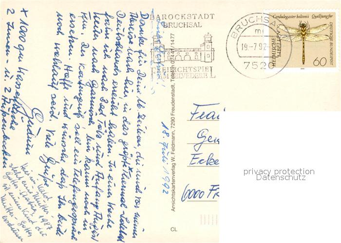 73655177 alte Postkarte Mingolsheim Teilansichten Parkanlage Kirche Schloss Denkmal Freibad postalisch gelaufen Erhaltung siehe scans [FriedD77] KatCode: 11110008215100