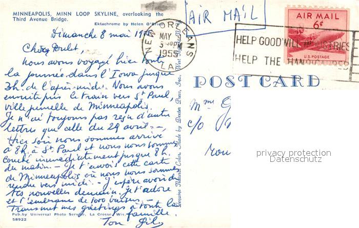 73057276 old postcard Minneapolis Minnesota Minn Loop Skyline overlooking the Third Avenue Bridge postalisch gelaufen Erhaltung siehe scans [WerneD78] KatCode: 14140250000000
