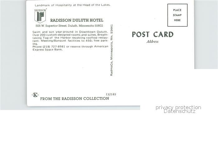 72490662 Minnesota City Radisson Duluth Hotel postalisch nicht gelaufen Erhaltung siehe scans KatCode: 14140250000000