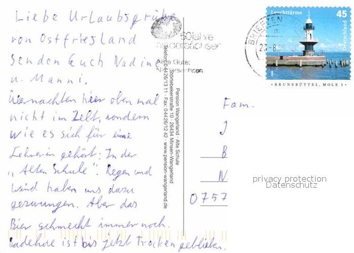 72751783 alte Postkarte Minsen Pension Wangerland Alte Schule Skulptur Landschaftspanorama postalisch gelaufen Erhaltung siehe scans [FriedD77] KatCode: 11110003455020