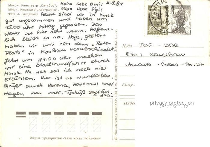 old postcard Minsk Weissrussland Kino Oktjabr postalisch gelaufen Ganzsache (eingedruckte Briefmarke) Erhaltung siehe scans