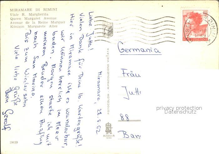old postcard Miramare di Rimini Koenigin Margarete Allee postalisch gelaufen Erhaltung siehe scans
