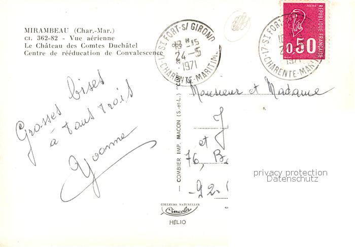 13524158 carte postale Mirambeau Charente-Maritime Fliegeraufnahme Chateau postalisch gelaufen Erhaltung siehe scans [LiesaD40] KatCode: 11170017117236