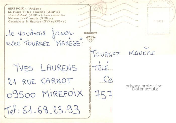 13258302 carte postale Mirepoix Ariege La Plage et les couverts Porte d’Aval Maison des Consuls Cathedrale St Maurice postalisch gelaufen Erhaltung siehe scans [WerneD78] KatCode: 11170009209194