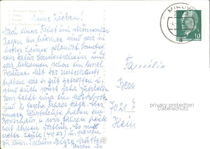 72373122 alte Postkarte Mirow Johannes R Becher Platz Torhaus Freibad Ernst Thaelmann Strasse postalisch gelaufen Erhaltung siehe scans KatCode: 11110013055044