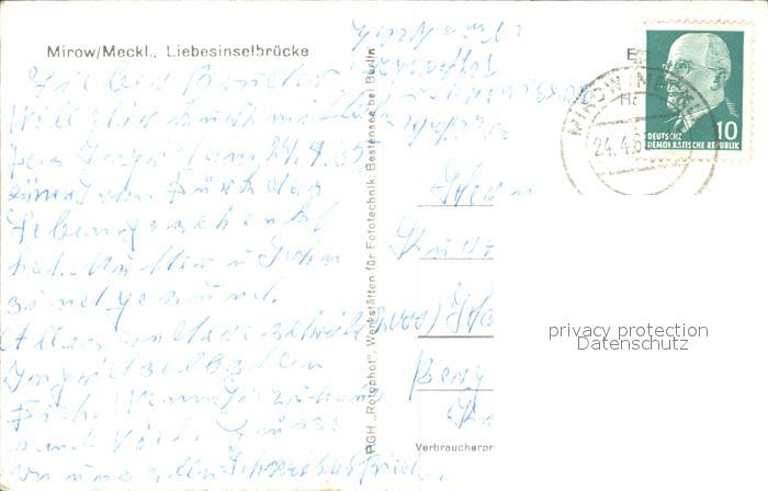 71983695 alte Postkarte Mirow Liebesinselbruecke postalisch gelaufen KatCode: 11110013055044