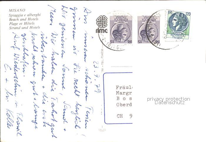 old postcard Misano Adriatico Beach und Hotels postalisch gelaufen Erhaltung siehe scans [LiesaD40]