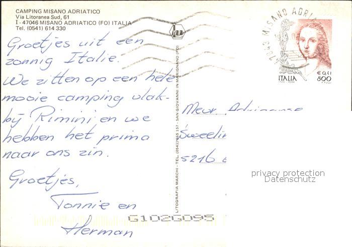 old postcard Misano Adriatico Fliegeraufnahme Camping Misano Adratico Strandpartien postalisch gelaufen Erhaltung siehe scans