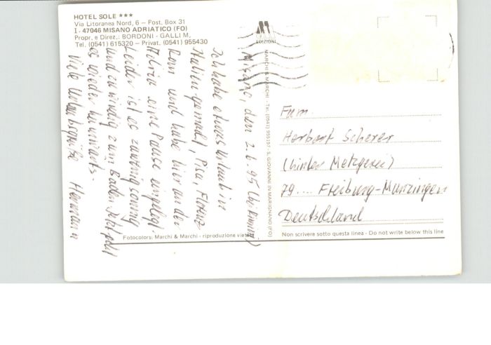 old postcard Misano Adriatico Hotel Sole Via Litoranea postalisch gelaufen
