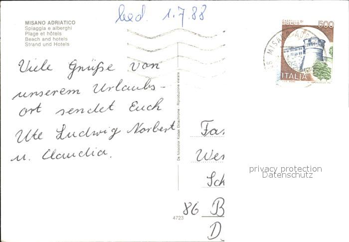 old postcard Misano Adriatico Strand Hotels postalisch gelaufen Erhaltung siehe scans