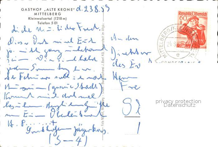 72480997 alte Postkarte Mittelberg Kleinwalsertal Gasthof Alte Krone Terrasse postalisch gelaufen Erhaltung siehe scans KatCode: 11390