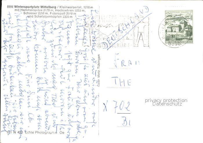 72516779 alte Postkarte Mittelberg Kleinwalsertal mit Hammerspitze Hochgehren postalisch gelaufen Erhaltung siehe scans KatCode: 11390